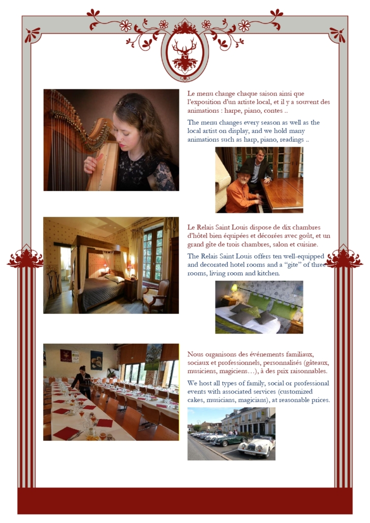 La cheminée est allumée tous les jours en automne-hiver et nous faisons des soirées à thème une fois par mois – soirée piano, guitare, lectures, raconteurs ..